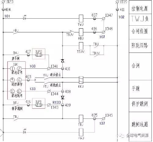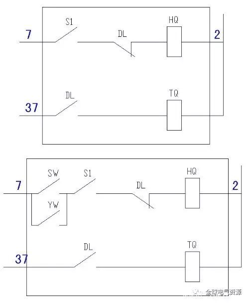 圖10為操作回路,主要包括控制手柄、微機(jī)操作回路和斷路器機(jī)構(gòu)的配合。請(qǐng)把圖片放大一點(diǎn)(點(diǎn)擊查看大圖)。在許多簡(jiǎn)圖中,斷路器機(jī)構(gòu)的合閘回路通常如圖11所示:“彈簧儲(chǔ)能S1常開(kāi)”、“斷路器分閘DL常關(guān)”、“合閘線(xiàn)圈HQ”串聯(lián),或增加“試驗(yàn)位置SW和操作位置YW常開(kāi)且并聯(lián)”來(lái)表示“斷路器手車(chē)只能在試驗(yàn)位置和操作位置閉合”。事實(shí)上,VS1斷路器通常配備有閉合鎖定電磁鐵,該電磁鐵由手車(chē)行程開(kāi)關(guān)(類(lèi)似于繼電器)控制。當(dāng)手車(chē)處于測(cè)試位置和操作位置以外的位置時(shí),電磁鐵斷電,其輔助觸點(diǎn)斷開(kāi)閉合電路。這屬于中央機(jī)柜的電氣鎖定(中央機(jī)柜還有許多其他電氣鎖定,例如通電時(shí)無(wú)開(kāi)口開(kāi)關(guān)柜后門(mén)等)。)。