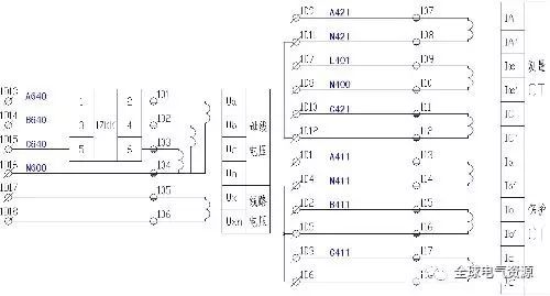 圖9為電壓電路,包括:保護(hù)電壓(和測(cè)量電壓)和測(cè)量電壓,均從機(jī)柜頂部的小母線(xiàn)引出。保護(hù)電壓在進(jìn)入保護(hù)裝置之前必須通過(guò)空氣開(kāi)關(guān),如圖4QF所示。不需要測(cè)量電壓。