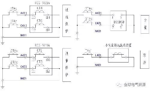 圖8顯示了電流回路,包括:保護(hù)、測(cè)量、計(jì)量和小電流接地線(xiàn)選擇。保護(hù)裝置和電能表安裝在開(kāi)關(guān)柜上,所有接線(xiàn)均由開(kāi)關(guān)廠(chǎng)連接。小電流接地選線(xiàn)裝置安裝在主控室,零序電流L401和N400需要通過(guò)控制電纜連接到該裝置。