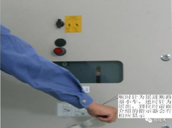 2.將斷路器手車的搖把插入搖把插座,順時針轉(zhuǎn)動搖把約20圈。當(dāng)曲柄明顯堵塞并伴有咔嗒聲時,取下曲柄。此時,手車處于測試位置。釋放輔助插件鎖。打開手推車房的門。手動斷開輔助插件,并斷開手車的主回路。