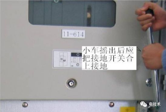 5.將接地開關(guān)的操作手柄插入中間門右下側(cè)的六角孔中,順時針旋轉(zhuǎn)使接地開關(guān)處于關(guān)閉位置。確認(rèn)接地開關(guān)已經(jīng)關(guān)閉后,打開機(jī)柜的下門,以便維護(hù)人員可以進(jìn)入維護(hù)和檢修。