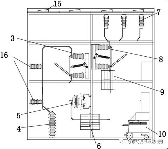 本發(fā)明公開了一種新型智能集成開關(guān)柜,包括左副柜體和右主柜體,副柜體的中間空間設(shè)有首先隔離開關(guān);首先隔離開關(guān)的上端通過導(dǎo)線與避雷器連接,下端通過導(dǎo)線與電子電流傳感器連接;