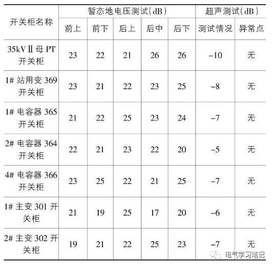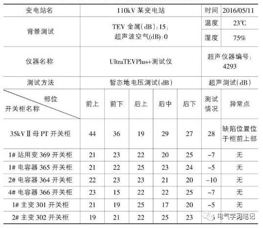 2016年5月11日,當(dāng)操作人員檢查一個110千伏變電站35kV的高壓室時,他們聽到輕微的間歇放電噪音。通知維護(hù)人員后,測試人員趕到現(xiàn)場,使用了UltraTEVPlus+測試儀。對電壓為11+35千伏和0+的110千伏高壓室進(jìn)行了瞬態(tài)地電壓試驗(yàn)(TEV)和超聲波局部放電試驗(yàn)(兩種檢測方法的數(shù)據(jù)如下表所示)。