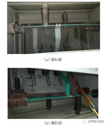 通過瞬態(tài)地電壓和超聲波兩種測試方法,對發(fā)現(xiàn)的缺陷進(jìn)行了處理。經(jīng)確認(rèn),110kv 變電站35kVⅱ母線PT開關(guān)柜上層母線倉積有嚴(yán)重污染。主要原因是前幾天的降雨導(dǎo)致母線排a相支柱絕緣子受潮,導(dǎo)致絕緣性能下降,從而導(dǎo)致局部放電故障的發(fā)生。