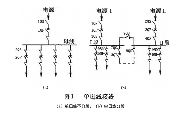當(dāng)只有一條電源引入線時(shí),通常使用這種連接,如圖1(a)所示。每條進(jìn)線和出線安裝一個(gè)隔離開(kāi)關(guān)和斷路器??拷€路的隔離開(kāi)關(guān)稱為線路隔離開(kāi)關(guān),靠近母線的隔離開(kāi)關(guān)稱為母線隔離開(kāi)關(guān)。